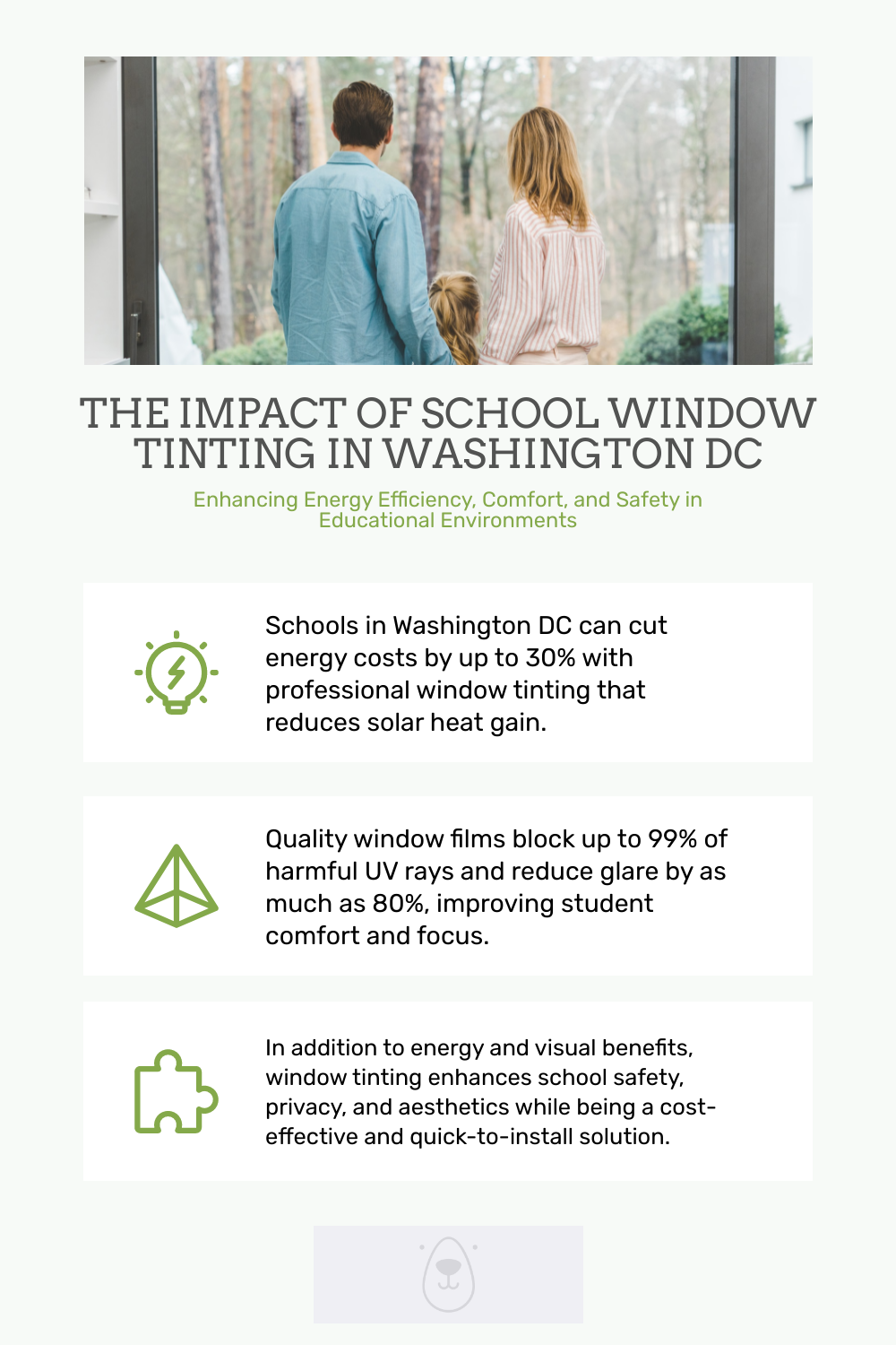Window tinting significantly reduces solar heat gain, which directly impacts a school’s energy consumption. With our expertly installed window films, schools can experience up to 30% energy savings by minimizing the need for air conditioning during DC’s warm seasons. This energy efficiency improvement is essential for large, glass-fronted buildings which are common in educational settings[source].