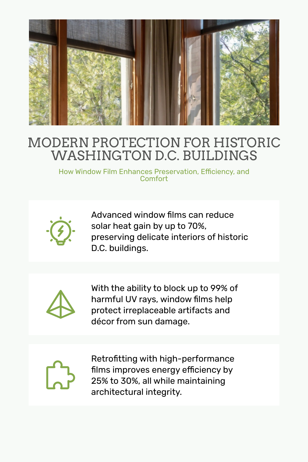 Visit our website for further information: DC Window Film. We are here to help you protect and enhance the beauty and functionality of your historic buildings with the best window film solutions in Washington D.C.